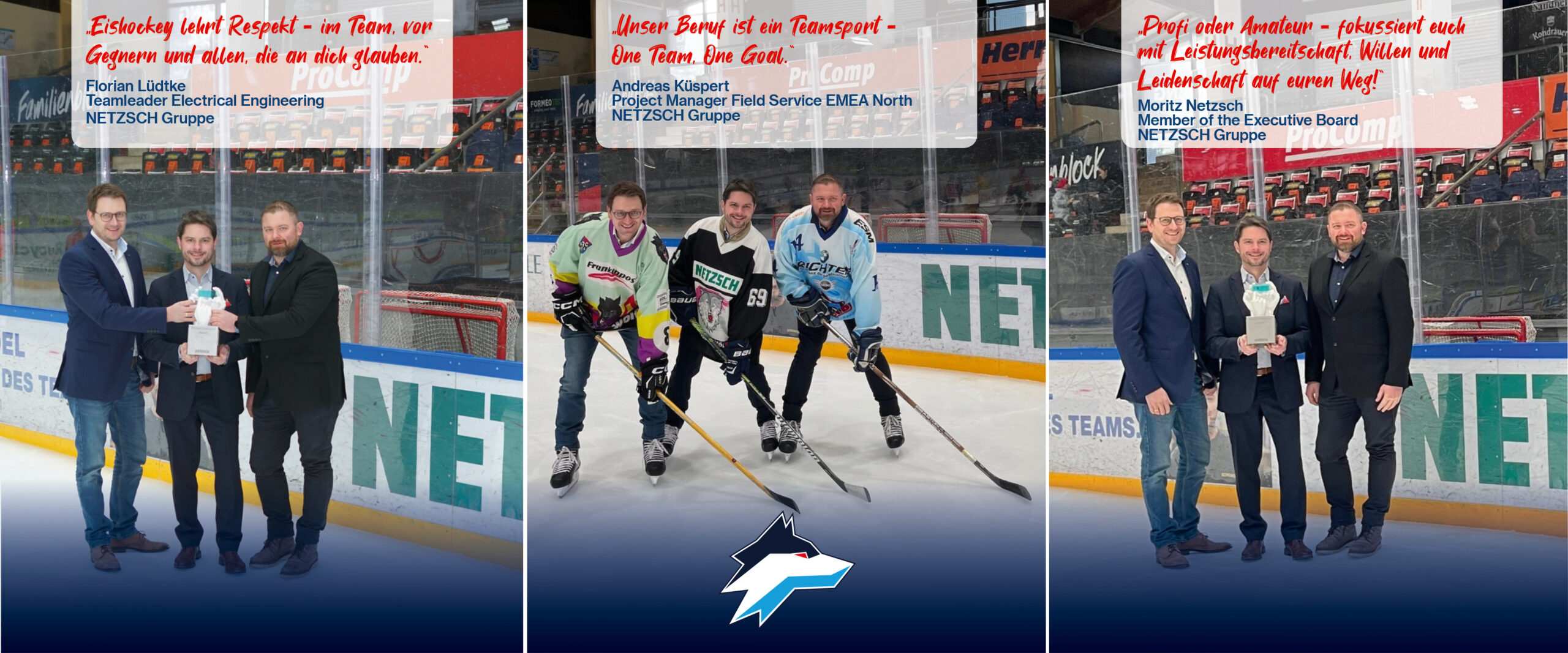 Selbstvertrauen, Teamgeist, Respekt und Wertschätzung – Werte, die Florian Lüdtke, Andreas Küspert und Moritz Netzsch bei den Selber Wölfe Juniors gelernt haben und heute bei der NETZSCH Gruppe leben.