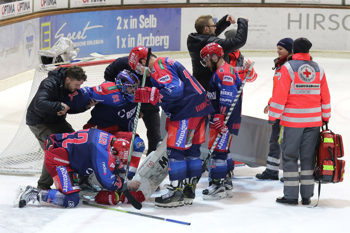 Doch dann wurde es still in der NETZSCH-Arena. Bei einem heftigen Zusammenprall verletzte sich unser Goalie Deske und konnte das Eis nur mit Hilfe der Sanitäter verlassen. Für ihn stand ab sofort Kümpel im Tor, der ebenfalls eine hervorragende Leistung zeigte. Wenige Sekunden vor der Pausensirene war es der Unparteiische, der den Unmut der 1.677 Zuschauer auf sich zog. Erst wurde Mudryk klar gelegt, doch die Arme des Schiedsrichters blieben unten. Als er dann auch noch eine zweiminütige Bankstrafe gegen uns verhängte, nahmen die Gäste das Geschenk des Unparteiischen dankend an und erzielten den Ausgleich.